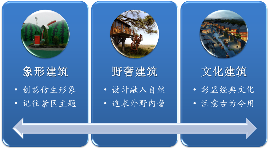 象形建筑設(shè)計:創(chuàng)意仿生形象,記住景區(qū)主題;野奢建筑設(shè)計:設(shè)計融入自然,追求外野內(nèi)奢;文化建筑設(shè)計:萃取經(jīng)典文化,注意古為今用。