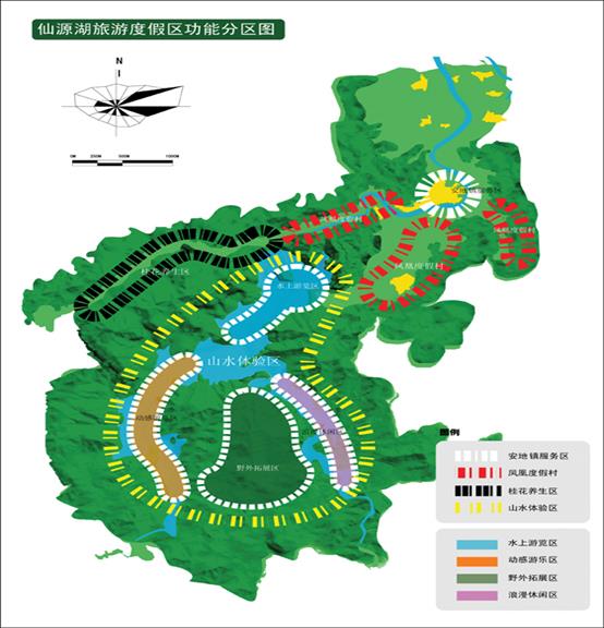 遵照上述功能結(jié)構(gòu)原則,仙源湖旅游度假區(qū)分為安地鎮(zhèn)服務(wù)區(qū)、鳳凰度假村、桂花養(yǎng)生區(qū)、山水體驗(yàn)區(qū)四大區(qū)域。