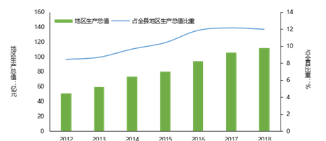 鎮(zhèn)域經(jīng)濟(jì)快速發(fā)展。地區(qū)生產(chǎn)總值從2012年的51.4億元快速增長(zhǎng)到2018年的112億元,年均名義增速達(dá)13.9%,占全縣比重從2012年的8.72%穩(wěn)步增加到2018年12.03%,持續(xù)引領(lǐng)全縣經(jīng)濟(jì)發(fā)展,以城帶鄉(xiāng)的能力逐步增強(qiáng)。