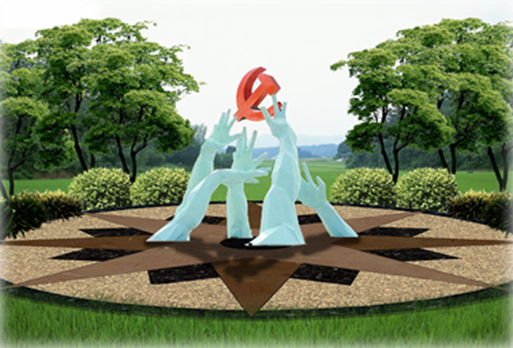 核心區(qū)以象征性雕塑彰顯五維共治主題。雕塑由五只手臂和一個黨徽組成,五只手臂象征 “五維共治理念” ;共同捧起的黨徽。喻指在黨的領(lǐng)導(dǎo)下和五維共治“理念引領(lǐng)下,實(shí)現(xiàn)山門村的美麗中國夢。