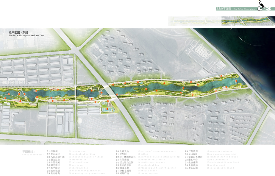 項目基地是煙臺黃金河入海一段。本次規(guī)劃設計范圍為天津南路橡膠壩以東至入??冢拥篱L度約 4.2 公里,河道寬度 140-170 米,總面積約 68.3 公頃,其中綠地面積約 11.5 公頃,水域面積約 56.8 公頃。