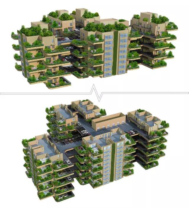 每層都有公共院落,每戶(hù)都有私人小院及一塊幾十平米的土地,可種花種菜、遛狗養(yǎng)鳥(niǎo),可將車(chē)開(kāi)到每層樓上的住戶(hù)門(mén)口,建筑外墻長(zhǎng)滿(mǎn)植物,人與自然和諧共生。
