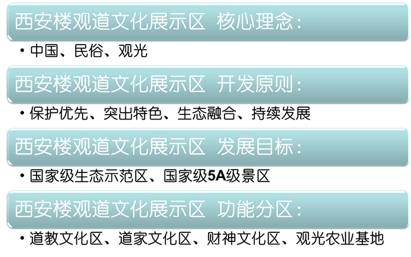 西安樓觀道文化展示區(qū)的開發(fā),將緊緊抓住“中國”、“民俗”和“觀光”這三個核心理念,按照“保護優(yōu)先、突出特色、生態(tài)融合、持續(xù)發(fā)展”的原則,高起點規(guī)劃,大氣魄謀篇,通過區(qū)縣攜手共建,確保實現(xiàn)“兩年成景點,三年成氣候,四年揚名中國”的建設目標,全面建成國家級生態(tài)示范區(qū)和國家5A級景區(qū)。成為城鄉(xiāng)統(tǒng)籌的破題之舉和城鎮(zhèn)化建設的扛鼎之作,成為陜西關中旅游產(chǎn)業(yè)的重要引擎和新的增長極,成為中國一流道文化旅游目的地。