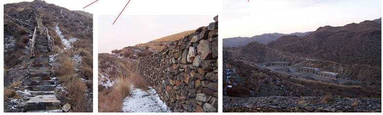 (現(xiàn)狀秦長(zhǎng)城入口; 現(xiàn)狀秦長(zhǎng)城半人高石頭墻; 50年代遺留解放軍兵營(yíng))