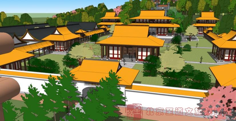 在通天寺西側(cè)溝谷內(nèi)建設(shè)祗園精舍禪修體驗區(qū),各個禪房依地形地貌采用自然式布局,并用茂密的植被營造清凈的氛圍,面向佛教深度體驗游客、居士,開展禪修靜養(yǎng)式度假。