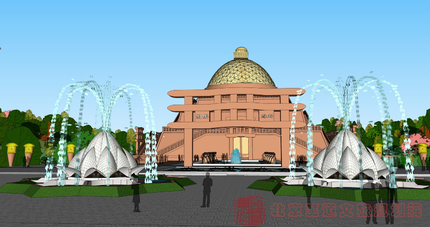 空間組織:在通天廣場最南端公路一側(cè)設(shè)置一座大型照壁作為對景,用淺浮雕的形式雕刻向游客展示佛陀悟道的經(jīng)典故事。在大門之前設(shè)計精美“七寶蓮池”,游客需先從蓮池上的石橋、汀步經(jīng)過。“七寶蓮池”之后為”緣起因果法門”,“緣起因果法門”借用了佛教思想的兩個基本觀點“緣起論”、“因果論”。緣起因果法門為兩道門,從行動路線看,游客需先經(jīng)過緣起門,再進(jìn)入因果法門,寓意人生在世皆因緣而起,以果為終。法門之后為凈池,寓意洗去塵世的污垢,跨入西天極樂世界。廣場外圍則由大理石柱環(huán)繞,每個石柱上雕刻佛教故事,柱頂上雕刻一座金佛,凸顯廣場的恢弘大氣與莊嚴(yán)肅穆。