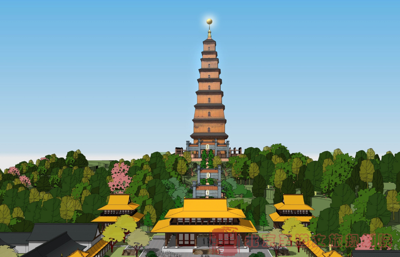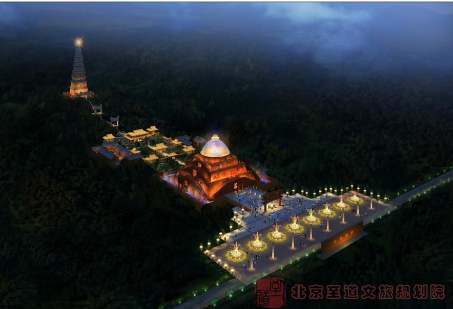 為了與通天佛國在宗教功能以及景觀需求上相呼應(yīng),在通天寺北側(cè)山頂上興建一座大型佛塔——通天塔。通天塔將是景區(qū)內(nèi)重要的景觀節(jié)點和文化節(jié)點,同時也是景區(qū)新的制高點,具有景觀地標(biāo)的功能。