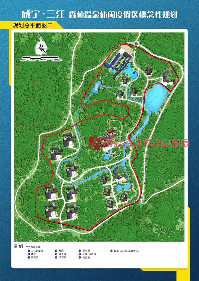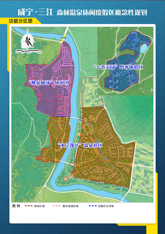 (1)“林泉仙湯”休閑區(qū)(2)“水案逸居”度假社區(qū)(3)“七香天園”野奢體驗區(qū)