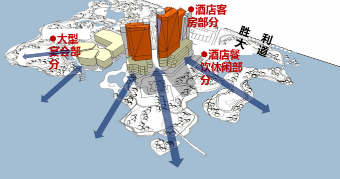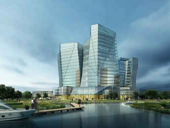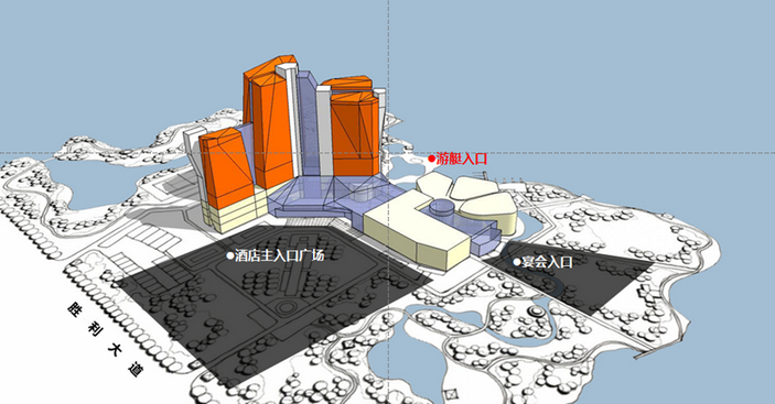 總體定位于五星酒店、湖濱商業(yè)旅游地產(chǎn)新地標(biāo)。形象口號(hào)是湖畔的璀璨晶體,核心思路是湖畔新地標(biāo)——綻放天際線;主體突出,集中布局的客房塔樓;化整為零,客房景觀與朝向優(yōu)化;空間重塑,景觀視覺廊道的形成。