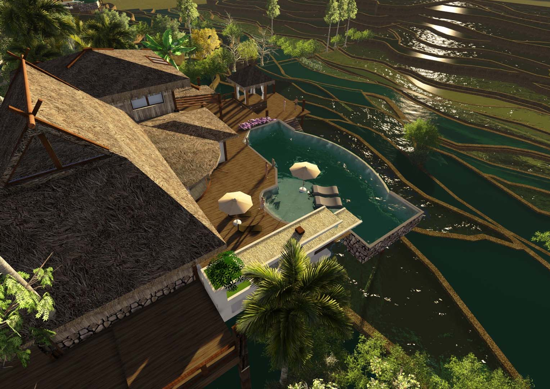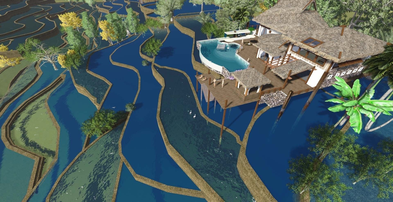 野奢風(fēng)格的梯田度假別墅設(shè)計(jì):借鑒熱帶氣候區(qū)經(jīng)典的“吊腳樓”結(jié)構(gòu);屋頂采用仿草材質(zhì),突出原生態(tài)野趣風(fēng)格;同時(shí)又配套泳池等奢侈性服務(wù)設(shè)施。每棟別墅陽臺面向梯田景觀視角。形成“紅塵不愿、自然很近”獨(dú)特魅力.