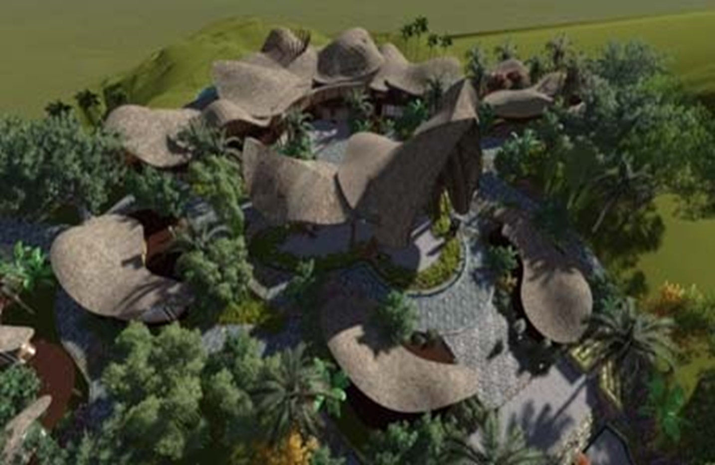 佤文化是翁丁的靈魂和核心,軸線貫穿整個(gè)度假村的南北,串聯(lián)了整個(gè)度 假村的核心片區(qū),包括度假酒店區(qū)和度假別墅區(qū),小品和景觀融入佤族元素的精髓,游客通過軸線設(shè)置的步行道、漫游道,可以欣賞到整個(gè)旅游度假村的美景,也方便游客到達(dá)每一個(gè)節(jié)點(diǎn)。佤文化景觀軸將整個(gè)度假村的文化和風(fēng)貌進(jìn)行了強(qiáng)烈的展現(xiàn)。