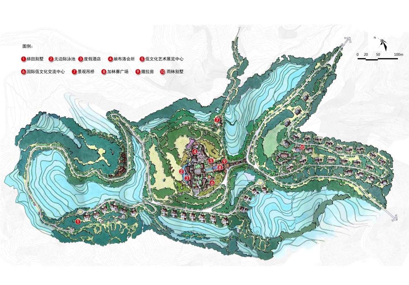 水景梯田廊:整合并提升梯田景觀,打造度假區(qū)的核心景觀支撐。 原始森林廊:依托下寨的熱帶雨林,建設(shè)森林觀光與康體健身運(yùn)動(dòng)。