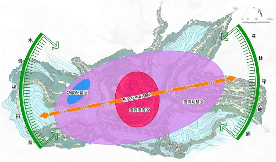 (3)三區(qū):度假酒店區(qū)、功能配套區(qū)、別墅組團(tuán)區(qū)