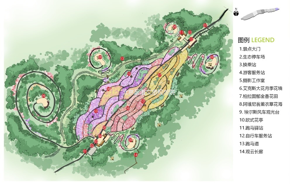 該區(qū)域以旅游觀光為主,禁止私家車進入,使用環(huán)保電瓶車組織車行交通,輔助以馬道和自行車道。集中展現(xiàn)齊岳山的“草、云、風(fēng)、光”四大賣點。