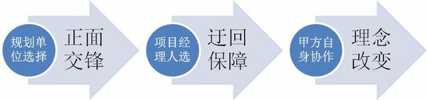那么如何實現(xiàn)三因素的優(yōu)化呢?簡言之:(1)規(guī)劃單位選擇——正面交鋒;(2)項目經(jīng)理人選——迂回保障;(3)業(yè)主自身協(xié)作——理念轉(zhuǎn)變。