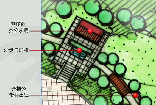 例如入口節(jié)點“春秋爭霸”,演繹成一個大型情境化沙盤:齊國山頭齊桓公頭像顯得霸氣十足;而令支孤竹兩國主微縮人像,在北部山頭飲酒作樂,對中原地區(qū)鄙夷不服模樣。——道具甚至可以進一步借助卡通化表達,如齊桓公長袖處標注“你們都得聽我的,我代表天子保護大家”;而令支孤竹兩國主酒杯間帶出酒滴狀標注牌“俺們才不理睬你什么中原霸主”。)